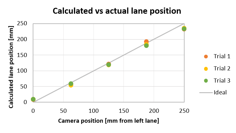 The midpoint between the intersections of these lines with the bottom of the image, compared to the middle of the camera's field of view, is fed as a positional error into a PID-regulator. The output from the PID is used to set the servo position. This process is repeated at roughly 15 frames per second. As seen below, the method we developed is quite accurate for determining the vehicle's lane position.