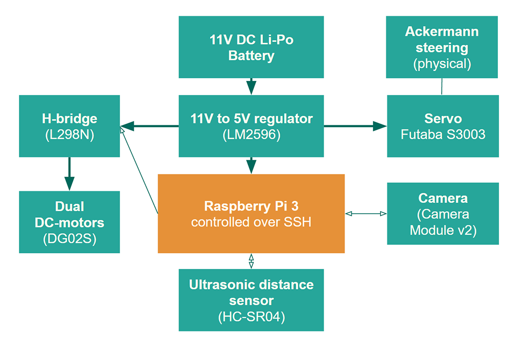After formulating a clear goal with our project, we made a plan for how to build the demonstrator. Since the real-time image processing requires some processing power, we decided to build around the Raspberry Pi 3. A Li-Po battery connected to a switching regulator powers the microcontroller, as well as other hardware. An H-bridge is used to control the motors. We never used it, but the setup is cable of steering the back wheels independently, as well as reversing their rotation. A positional servo is used to steer the two front wheels. The vehicle acts upon input from the ultrasonic distance sensor (for emergency breaking) and, of course, the camera which detects the lane markings.